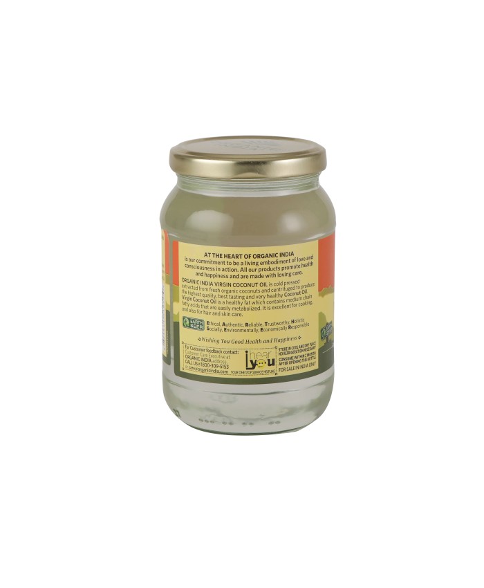 ORGANIC INDIA Ulei (Extra)Virgin de Cocos Premium 500ml este un produs 100% Certificat Organic si nu contine organisme modificate genetic. Nu contine si nu sunt folosite in niciun stagiu al productiei pesticide sintetice, erbicide, ingrasaminte sau alte tratamente chimice.
